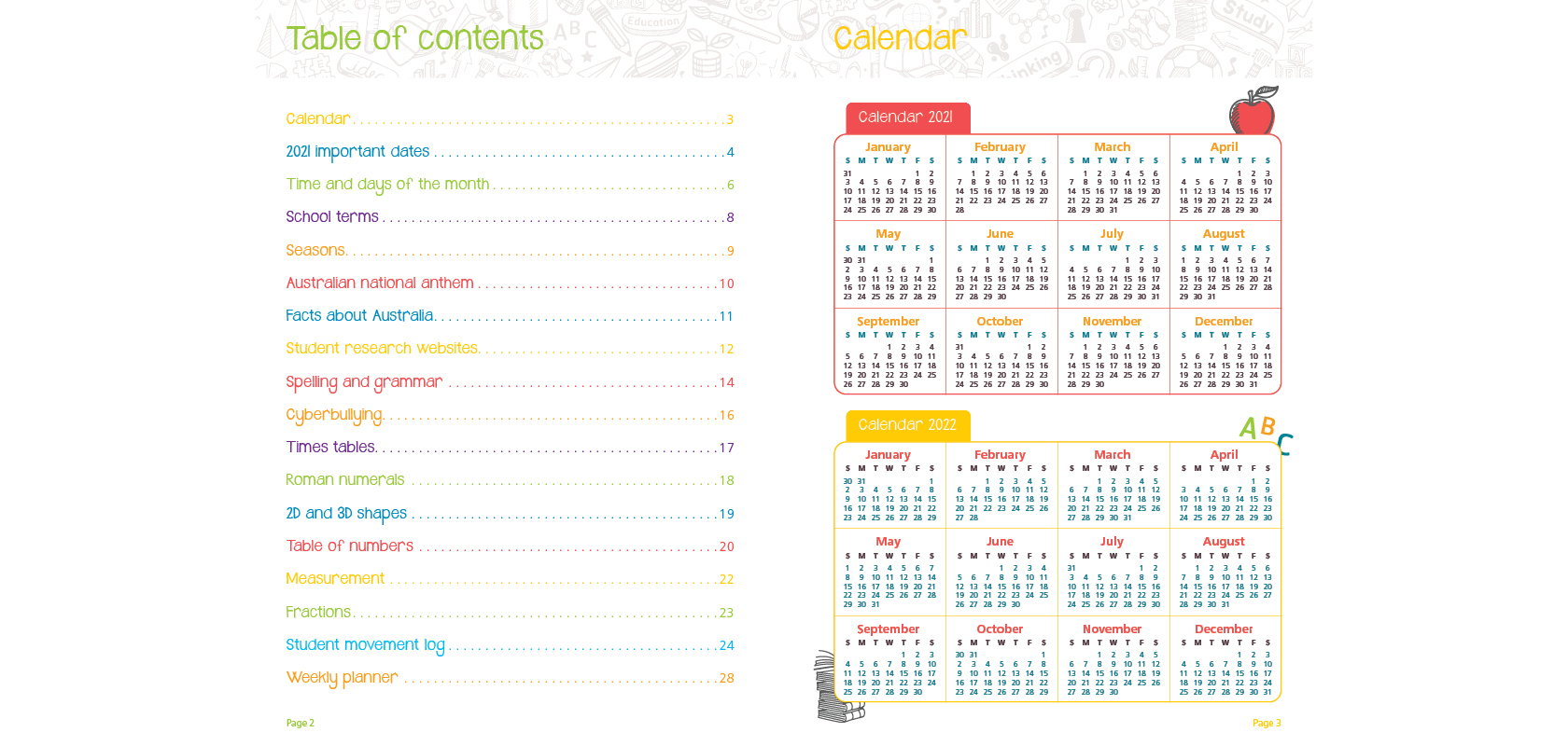 With family budgets in mind, it is priced to accommodate and consists of 128 vibrant pages including a contact page, 20 pages of educational content and calendar pages running from the beginning of Term 1 to the end of Term 4.